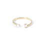 Introducing the “Spectral Halo Ring” — a sleek and modern piece that epitomizes minimalist elegance. This open cuff ring is crafted from polished gold, featuring a unique design where each end is crowned with a brilliant stone. This symmetry not only adds balance but also enhances the ring’s overall sophistication and contemporary appeal.