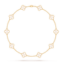 This beautiful necklace is made of 18K solid gold and has 10 clover-shaped motifs. Each one has natural mother of pearl stone, which gives a soft, elegant shine.