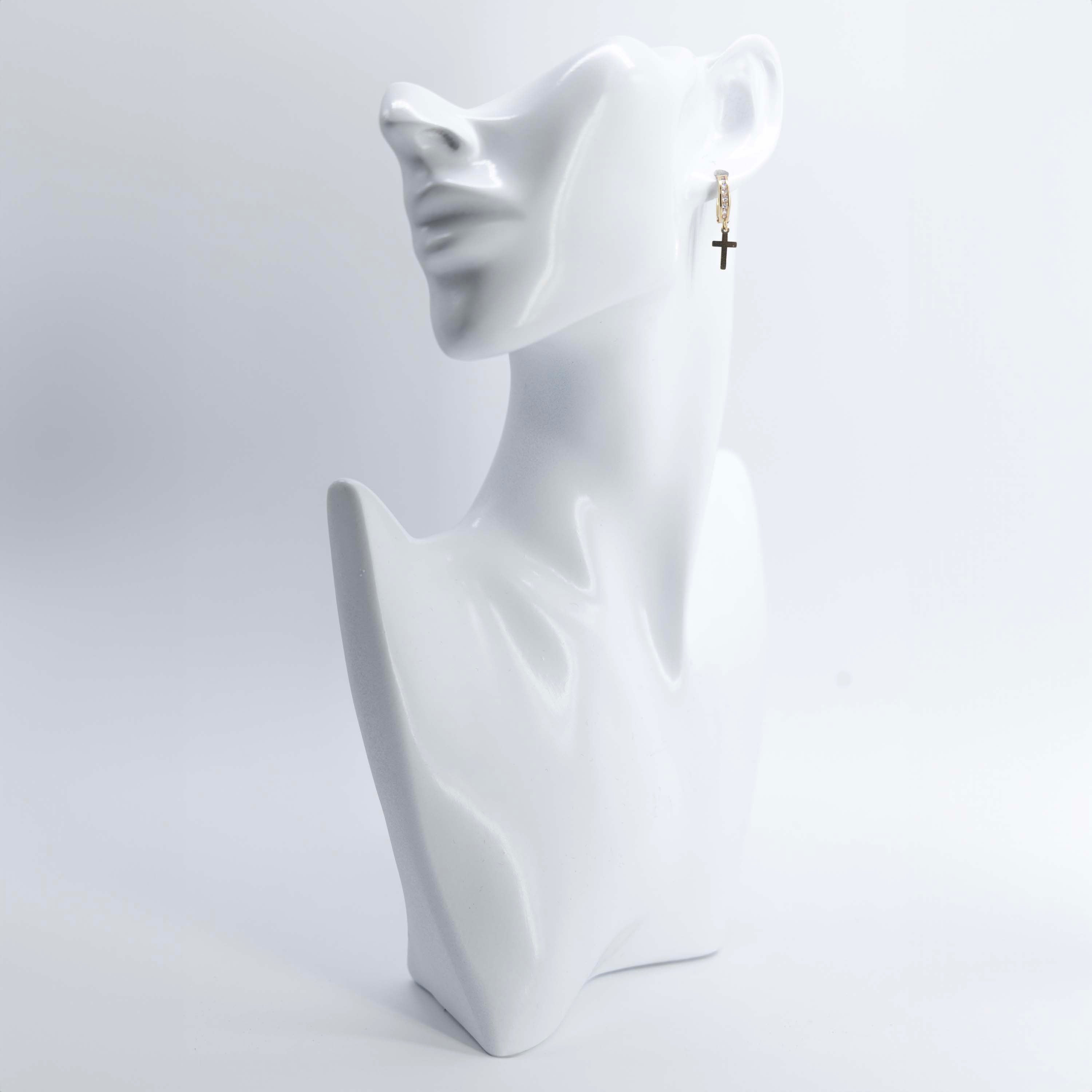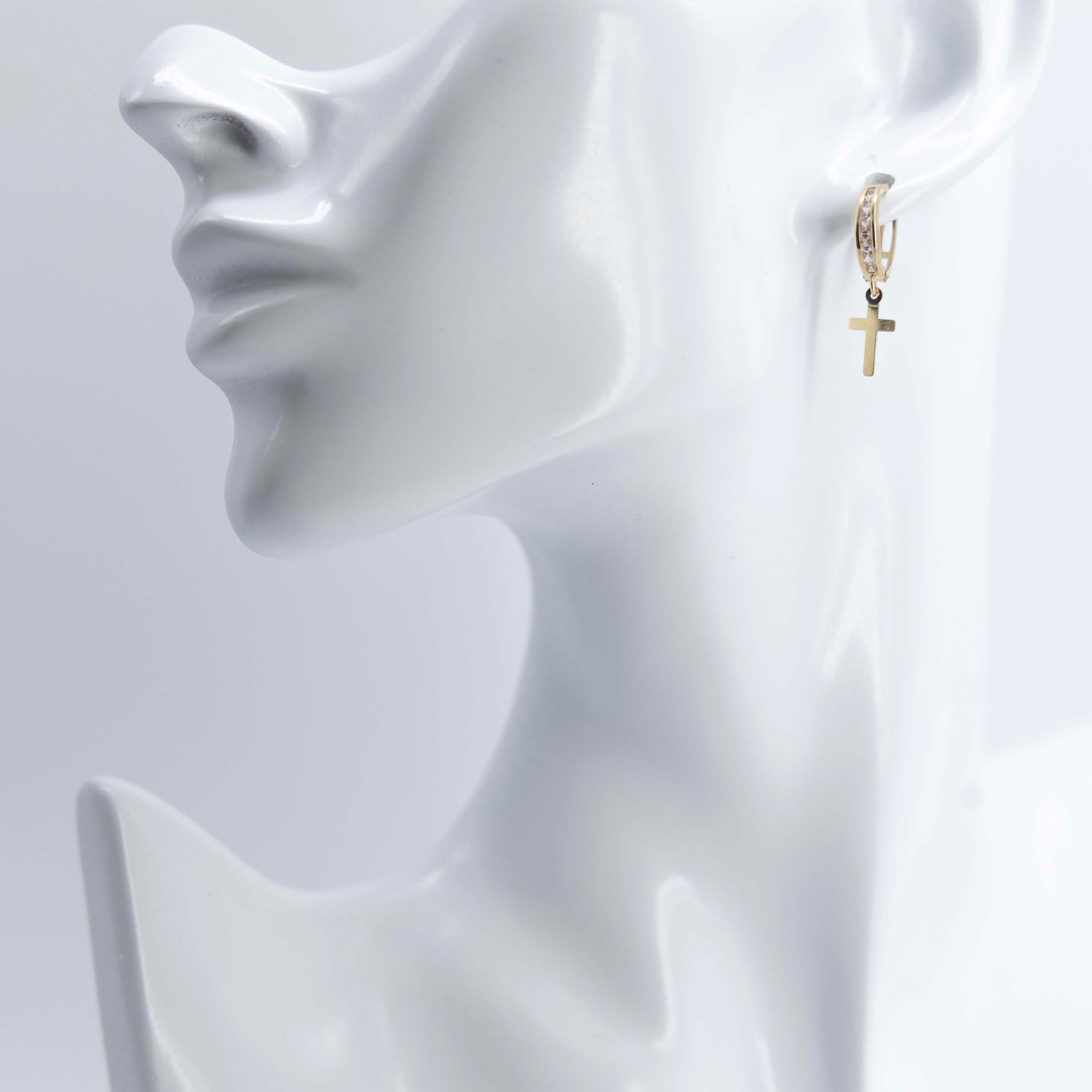 These elegant gold earrings feature a striking cross shape design. Made with a touch of luxury and sophistication, they are the perfect accessory to elevate any outfit. Add a touch of timeless style to your look with these fancy earrings.