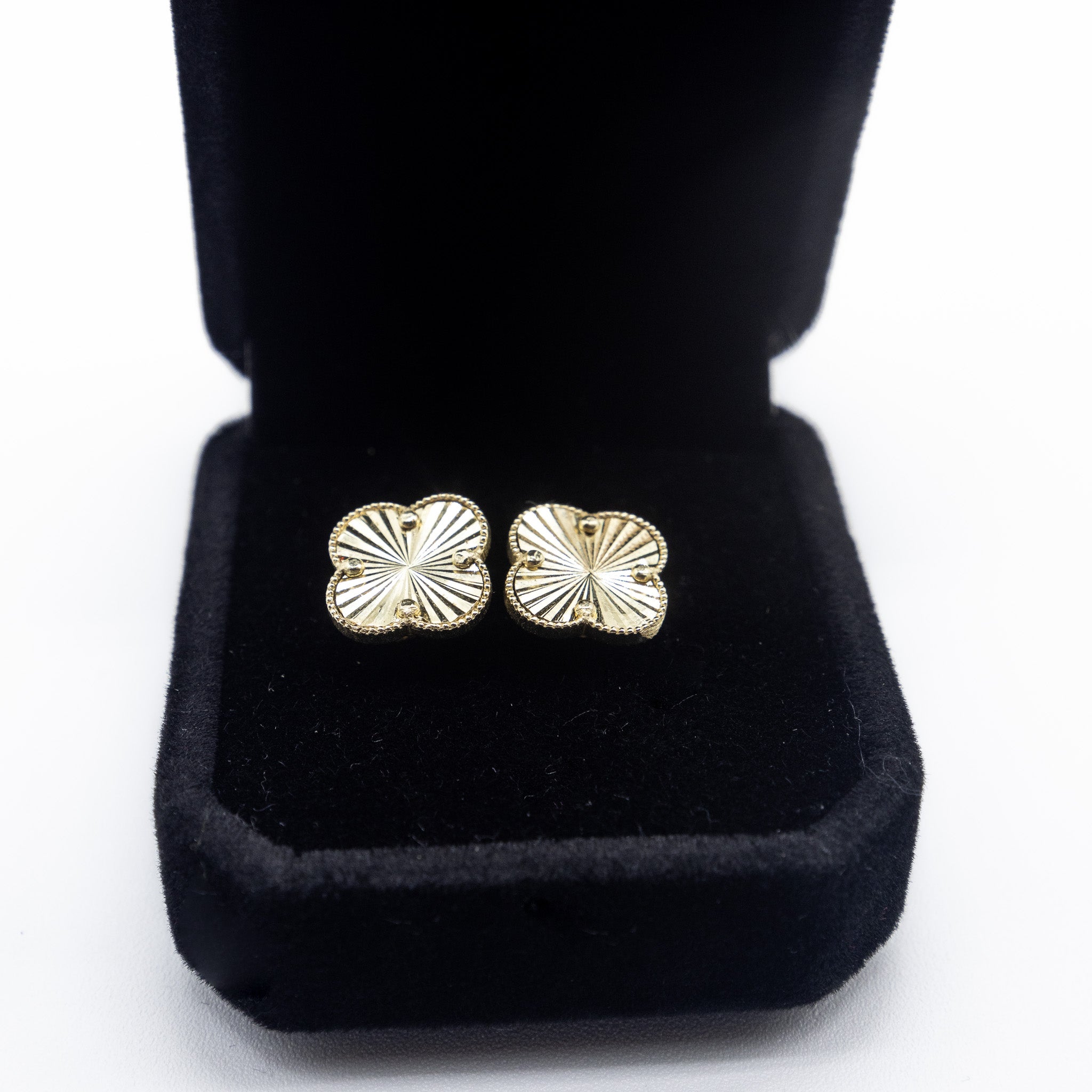 Elevate your style with these VC style fancy gold earrings. Crafted with intricate gold clover details. Perfect for any occasion, these earrings will add a pop of shine and elegance to your look. Upgrade your jewelry collection today.
